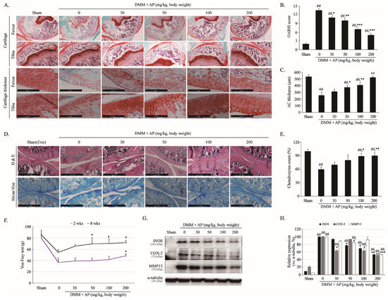 The in vivo chondroprotective effect of AP was confirmed using the DMM model, which is a surgical procedure used to induce OA through an incision of the medial meniscus and is most similar to the pathogenesis of OA in humans. To determine the chondroprotective effect, safranin O/Fast Green staining, hematoxylin and eosin (H&E) staining, and Alcian blue staining were performed. The von Frey test was performed to confirm pain reduction, and the expression of cartilage matrix-degrading enzymes in the tissue was analyzed using Western blot analysis. As a result of performing safranin O/Fast Green staining, which is a representative histological analysis of cartilage, weaker staining and rougher surfaces were observed in the DMM group compared to the sham group (Figure 2A). On the other hand, in the group that received AP orally every day for 8 weeks, the staining was darker, and the surface roughness was reduced (Figure 2A). The results in Figure 2B were evaluated using Osteoarthritis Research Society International (OARSI) scores through a three-person blind test for Figure 2A. The score in the DMM group was 14 ± 0.57, while the scores in the groups administered 30, 50, 100, and 200 mg/kg AP were 11 ± 0.56, 10 ± 0.57, 7 ± 0.57, and 5 ± 0.28, which were decreases of 19%, 26%, 49%, and 65%, respectively (Figure 2B). In addition, analysis of articular cartilage (AC) thickness stained with safranin O showed that the tibia and femur cartilage thickness increased in the AP-treated group compared with the DMM group (Figure 2C). Similarly to the results of safranin O staining, the results of H&E and alcian blue staining also showed that the cartilage surface gradually became smoother in the AP-treated group compared to the DMM group (Figure 2D). Furthermore, H&E staining showed that the chondrocyte survival rate was higher in the AP-treated group compared to the DMM group, but no significance was observed at 30 mg/kg (Figure 2E). Two weeks after AP administration, there was no significant difference in pain reduction between the groups; however, pain was relieved at 8 weeks of AP 50 mg/kg or higher (Figure 2F). To analyze the cause of these effects, the protein expression of cartilage matrix-degrading enzymes and inflammatory factors was examined. Compared with the control group, the protein expression of iNOS, COX-2, and MMP13 in the DMM group was significantly increased, but AP reduced their expression in a concentration-dependent manner (Figure 2G,H). These results indicate that AP alleviates OA by decreasing cartilage matrix-degrading factors, increasing cartilage amounts, and attenuating cartilage thickness degradation in vivo.