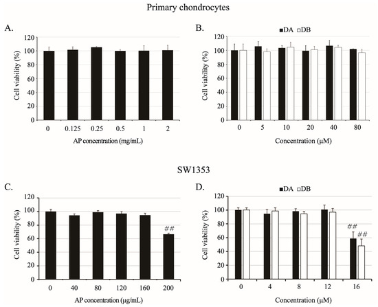 Effects of AP, DA, and DB on viability of rat primary chondrocytes and SW1353 cells. Cells were treated with AP (primary chondrocytes, 0.125, 0.25, 0.5, 1, and 2 mg/mL; SW1353, 40, 80, 120, 160, and 200 μg/mL), DA (primary chondrocytes, 5, 10, 20, 40, and 80 μM; SW1353, 4, 8, 12, and 16 μM), and DB (primary chondrocytes, 5, 10, 20, 40, and 80 μM; SW1353, 4, 8, 12, and 16 μM) for 24 h, and viability was determined by MTT assay. Cytotoxicity of AP (A), DA and DB (B) on primary chondrocytes; AP (C), DA and DB (D) on SW1353 cells. Untreated cells served as controls and were considered 100% viable. Data represented as mean ± SD of five independent experiments. ## p < 0.05 compared with control (0) group.