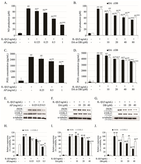 Inhibitory effects of AP, DA, and DB on IL-1β-induced nitrite, PGE2, iNOS, and COX-2. Primary chondrocytes were pre-treated with AP (0.125, 0.25, 0.5, and 1 mg/mL), DA (10, 20, 40, and 80 μM) and DB (5, 10, 20, 40, and 80 μM) for 1 h, followed by IL-1β (5 ng/mL) stimulation for 24 h. Nitrite production of AP (A), DA, and DB (B) was determined in cultured medium using Griess reagent. PGE2 production AP (C), DA and DB (D) was determined in cultured medium using ELISA kit. Expression of iNOS and COX-2 was determined using Western blot analysis; AP (E), DA (F) and DB (G). (H–J) Quantitative data of (E–G) were analyzed using ImageJ software (version 1.53). α-Tubulin served as internal control. n = 5 per group. Data are represented as mean ± SD of five independent experiments. ## p < 0.05 vs. control group; * p <0.05, ** p <0.01, and *** p < 0.001 compared with IL-1β-treated group.