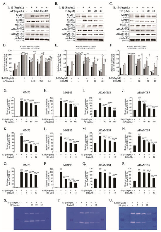 Inhibitory effects of AP, DA and DB on IL-1β-induced MMP1, MMP3, MMP13, ADAMTNS4, and ADAMTS5. Primary chondrocytes and SW1353 cells were pre-treated with AP, DA, and DB for 1 h, followed by IL-1β stimulation for 24 h. Protein levels of MMP1, MMP3, MMP13, ADAMTS-4, and ADAMTS5 in primary chondrocytes were determined using Western blot analysis; AP (A), DA (B), and DB (C). (D–F) Quantitative data of (A–C) were analyzed using ImageJ software (version 1.53). α-tubulin served as internal control. mRNA levels of MMP3, MMP13, ADAMTS4, and ADAMTS5 in SW1353 cells were determined using real-time PCR; AP (G–J), DA (K–N), and DB (O–R). Activities of secreted cartilage-degrading enzymes were analyzed using gelatin zymography; AP (S), DA (T) and DB (U). n = 5 per group. Data are represented as mean ± SD of five independent experiments. ## p < 0.05 vs. control group; * p < 0.05, ** p < 0.01, and *** p < 0.001 compared with the IL-1β-treated group.