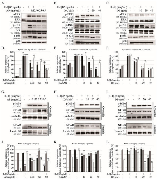 Effects of AP, DA, and DB on IL-1β-induced phosphorylation of MAPKs (ERK, JNK, and p38) and activation of NF-κB signaling. Primary chondrocytes were pre-treated with AP (0.125, 0.25, and 0.5 mg/mL), DA (10, 20, and 40 μM), and DB (10, 20, and 40 μM) for 1 h, followed by IL-1β (5 ng/mL) stimulation for 3 h. Protein expression levels of MAPK (ERK, JNK, and p38) and NF-κB (IκBα and p65) were determined using Western blot analysis. MAPKs: AP (A), DA (B), and DB (C); NF-κB: AP (G), DA (H), DB (I). (D–F,J–L) Quantitative data of (A–C,G–I) were analyzed using ImageJ software (version 1.53). n = 5 per group. Data are represented as mean ± SD of five independent experiments. ## p < 0.05 vs. control group; * p < 0.05, ** p < 0.01, and *** p < 0.001 compared with IL-1β-treated group.