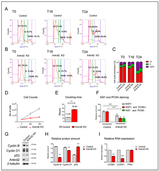 Our reported evidence demonstrated that the reduction in the expression of Ankrd2 results in decreased cellular proliferation and clonogenic potential of OS-derived cell lines [14]. This evidence prompted us to investigate the contribution of Ankrd2 to cell cycle progression. To this aim, the level of expression of Ankrd2 was silenced by specific Sh-RNA and Ankrd2-knockdown (KD) clones created accordingly. Ankrd2 KD and control cells were synchronized for 72 h and then induced to proliferate by growth serum supplementation. After 16 and 24 h, cells were collected and processed for flow cytometric analysis. As control, cells were also harvested at T0. Results revealed that, compared to controls, the absence of Ankrd2 resulted in a longer cellular retention in G1, with few cells in S and G2/M phases (Figure 1A,B, T16). Confirming this delay, an increase in cells in G2/M at T24 was reported for control samples only (Figure 1A,B, T24). The impairment of Ankrd2 KD cells for proper duplication was supported by the calculation of their growth rate (Figure 1D) and doubling time (Figure 1E). Specifically, the growth rate was lower in Ankrd2 KD cells, while the doubling time was more than double that of controls. These findings corroborate our earlier results demonstrating that Ankrd2 absence inhibits cell proliferation [14] and provide additional insights into the mechanisms underlying this phenomenon.