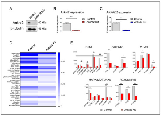 Results showed that, compared to mock-transfected controls, Ankrd2-knockdown cells exhibited a robust decrease in the phosphorylation of proteins belonging to the PI3K/Akt cascade, including PDK1, Akt and its direct effectors GSK3β, Bad, eNOS, and FoxO1 and FoxO3 (Figure 2D,E). Interestingly, a significant reduction in phosphorylation was reported for mTOR and its direct substrate p70S6K (Figure 2D,E). RPPA results also pointed to a significant reduction in the activation of ERK1/2, suggesting an alteration of the signaling cascades upstream of the MAPKs. Another particular feature observed in Ankrd2-knockdown cells was the impaired activation of several Receptor Tyrosin Kinases (RTKs) and downstream adaptors, including IRS1 and Tyk2, which further pointed to the decreased ability of these cells to properly sense and propagate mitogenic stimuli (Figure 2D,E).