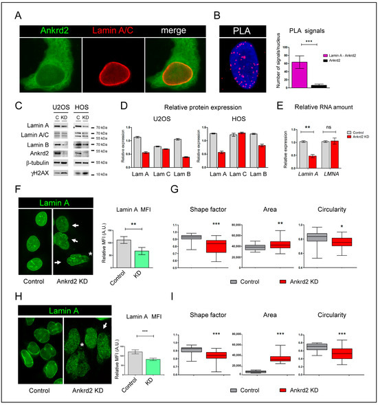 Following the demonstration that reduced Ankrd2 expression impairs proliferation and mitogenic response in U2OS cells, another aspect that we deemed particularly relevant for Ankrd2 functions was then investigated. Lamin A and lamin C (lamin A/C) are components of the nuclear lamina. By interacting with several proteins involved in epigenetic modifications, inflammation, and mechanosignaling [18], lamin A/C play a crucial role in many cellular processes such as proliferation, differentiation, migration, and stemness. The importance of lamin A/C is highlighted by the fact that the disruption of their functions is related to the onset of malignancies [19] and genetic disorders, known as laminopathies [20]. Interestingly, previous studies from our laboratory demonstrated that, in muscle cells, lamin A/C interacted with Ankrd2, modulating Ankrd2 shuttling to and out of the nuclei [13]. Therefore, to determine if Ankrd2 also binds to lamin A/C in OS-derived cells, we first conducted an immunofluorescence evaluation on control cells. Co-immunolocalization and proximity ligation assay (PLA) analyses, shown in Figure 3A,B, revealed that lamin A/C and Ankrd2 co-localize at the nuclear rim. To explore the consequences of Ankrd2 reduction on lamin A/C expression and nuclear distribution, Ankrd2 KD cells were then subjected to additional biomolecular investigations. These analyses revealed a selective decrease in lamin A expression (both protein and transcript), as no changes were observed for lamin C (Figure 3C–E). Immunostaining of Ankrd2-silenced cells with an antibody specific for lamin A confirmed the reduction in lamin A expression (Figure 3F), and revealed nuclear abnormalities, such as ruptures, blebs, and alterations in nuclear shape, size, and circularity (Figure 3F,G). Ankrd2 knockdown gave similar effects also in HOS, another human OS-derived cell line (Figure 3C,D,H,I). The destabilizing effect of Ankrd2 silencing on the nuclear lamina also extended to lamin B1, whose expression was significantly reduced in both U2OS and HOS Ankrd2-silenced cells (Figure 3C,D).