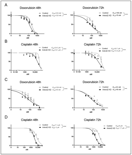 Ankrd2 reduction strengthens the cytotoxic effect of doxorubicin and cisplatin. (A,B) Viability assays performed on mock-transfected and Ankrd2-knockdown U2OS cells (control and Ankrd2 KD, respectively) treated for 48 and 72 h (48 h and 72 h) with concentrations of doxorubicin (A) and cisplatin (B) (30–1000 nM and 1–50 µM, respectively). IC50 values were calculated by GraphPad Prism 6 software. (C,D) The same analyses were performed on HOS cells. Three replicates per tested concentration, and at least three independent experiments were performed. Statistical analysis was performed by two-way ANOVA; *** p ≤ 0.001, **** p < 0.0001.