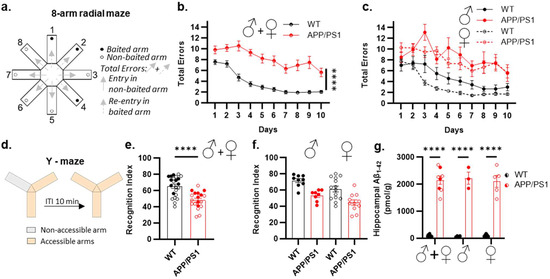 The memory performance of male and female APP/PS1 mice was evaluated using two distinct but complementary paradigms, each tailored to target spatial memory processes particularly vulnerable to AD pathology [35]. First, we used the spatial discrimination paradigm in the eight-arm radial maze, which required learning and remembering the spatial location of three constantly baited arms (Figure 1a). Acquisition curves demonstrated that the performance of male and female APP/PS1 and WT mice improved over the 10-day training period, as indicated by a progressive decline in the daily mean number of total memory errors (Figure 1b). However, APP/PS1 mice exhibited slower acquisition in the spatial discrimination task compared to WT mice (Figure 1b). Importantly, the observed spatial discrimination impairment was similar across male and female APP/PS1 mice, indicating no sex-dependent differences (Figure 1c).