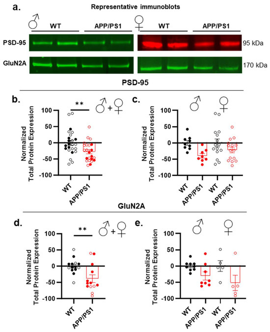 Hippocampal expression of cerebral markers in male and female APP/PS1. (a) Representative Western blots of the different brain markers analyzed in APP/PS1 and WT mice. (b,c) Changes in PSD-95 protein observed between WT and APP/PS1 mice (b) are not sex-dependent (c). (d,e) Changes in GluN2A subunits observed between genotypes (d) show no difference between female and male APP/PS1 and WT (e). Data points are individual mice with mean ± SEM. Statistical significance was calculated using the t-test (b,d) and two-way ANOVA (c,e), ** p < 0.01.