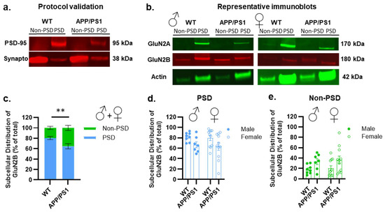 Postsynaptic (PSD) and non-postsynaptic (non-PSD) hippocampal expression of cerebral markers in male and female APP/PS1. (a) Representative Western blots of the different brain markers analyzed in APP/PS1 and WT mice used for the validation of the fractionation protocol. (b) Representative Western blots of the different brain markers analyzed in male and female APP/PS1 and WT mice. (c–e) Changes in the level of GluN2B subunits of NMDA receptors are observed between PSD and non-PSD compartments between APP/PS1 mice compared to the WT (c), with no sex effect observed for both PSD (d) and non-PSD (e) compartments. Data points are individual mice with mean ± SEM. Statistical significance was calculated using two-way ANOVA (c–e), ** p < 0.01.