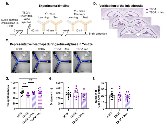 DL-TBOA-induced glutamate spillover alters spatial discrimination performance in mice. (a) Experimental timeline. (b) Coronal diagrams of mouse brain sections showing injection sites in dorsal hippocampus. Scale bar: 0.5 mm. (c) Representative heatmaps during retrieval phase in Y-maze for each group of mice. (d) Spatial memory was impaired in mice injected with DL-TBOA compared to aCSF, an effect that was time-dependent, as treated mice performed at the level of aCSF-injected mice after 7 days (TBOA rec.). The deleterious effect of DL-TBOA was blocked by the simultaneous injection of GluN2B subunit blocker ifenprodil (TBOA + Ifen.). (e,f) Injection of DL-TBOA and DL-TBOA + ifenprodil did not affect mouse exploratory activity, such as distance passed (e) and number of open-arm entries (f) during the initial phase of training. Data points are individual mice with mean ± SEM. Statistical significance was calculated using one-way ANOVA (d–f), ** p < 0.01.