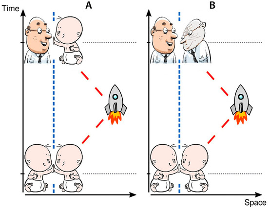 In 1888 and 1895, H. Wells’ fiction novels introduced the idea of traveling in time. In 1911, physicists formulated the Twin Paradox that took hold of minds since it illustrated time dilation and decelerated aging. In this paradox, one of two twins takes a spaceflight at near-light speed to a distant star and later returns to Earth. Upon his return, he will be younger than his terrestrial twin (Figure 1A) according to Einstein’s special relativity [2].