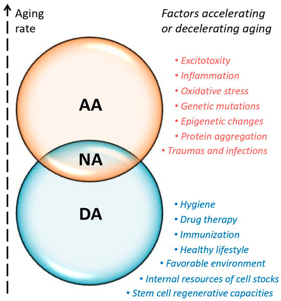 NA can be defined as a conditional balance between AA and DA with a compromise combination of relevant factors (see Figure 2). Factors that accelerate aging include excitotoxicity, inflammation, oxidative stress, genetic mutations, epigenetic changes, protein aggregation, traumas, and infections. The factors decelerating aging are a healthy lifestyle, a favorable environment, hygiene, immunization, the regenerative capacities of stem cells, internal resources of cell stocks, and some types of drug therapy.