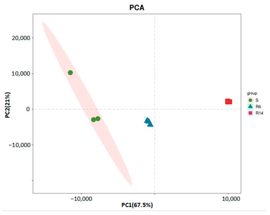 The PCA based on transcriptome sequencing data showed that the sequencing results of R6 and R14 strains had good repeatability and obvious separation trends among different samples (Figure 1); PC1 accounted for the largest variance in the transcriptomic data, representing 67.5% of the total variance. On the PC1 axis, the S, R6, and R14 strains exhibited a clear separation trend, indicating significant differences in gene expression levels. PC2 accounted for the second-largest variance in the data, representing 21% of the total variance. It further distinguished the differences between R6 and R14. On the PC2 axis, the samples of R6 and R14 also showed good reproducibility, indicating that they shared some similarities in transcriptional levels but also exhibited unique gene expression patterns. The PCA demonstrated there were significant differences at the transcriptional levels among the S, R6, and R14 strains.
