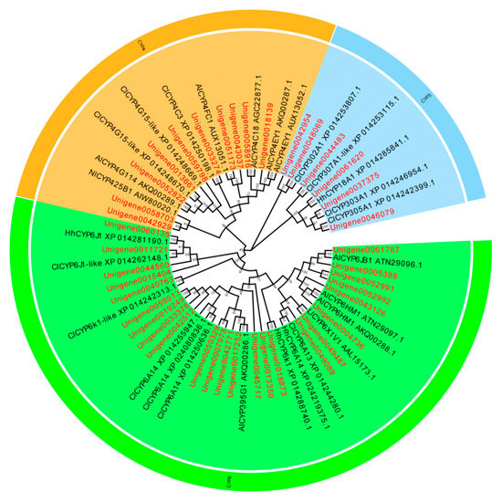 A total of 119 P450 genes, 39 GST genes, 45 CarE genes, and 123 ABC genes were identified in the L. pratensis transcriptome. After excluding shorter sequences and those with greater genetic distances, the remaining sequences have complete open reading frames (ORFs). The average length of the Cytochrome P450, GST, GarE, and ABC transporter gene sequences are 1125, 558, 1097, and 2043 bp, respectively, encoding 306–375, 135–169, 135–169, and 446–857 amino acids. The genes annotated with Cytochrome P450, GST, and ABC were analyzed using EdiSeq software (Version 8.1) to match amino acid sequences and aligned with the Cytochrome P450, Glutathione-S-transferase, Carboxylesterase, and ABC transporter amino acid sequences of Cimex lectularius, Apolygus lucorum, Halyomorpha halys, Nesidiocoris tenuis, Subpsaltria yangi, Macrosteles quadrilineatus, and Laodelphax striatellus in the NCBI database to construct phylogenetic trees. P450 gene sequences were divided into three evolutionary branches belonging to the CYP3 (6 genes), CYP4 (11 genes), and CYP6 subfamily (24 genes) (Figure 3). There were 23 GST genes distributed across five different subfamilies: GST-Delta (D), GST-Epsilon (E), GST-Zeta (Z), GST-Theta (T), and GST-Sigma (S) (Figure 4); 27 ABC genes were distributed across five different subfamilies: ABC-A, ABC-B, ABC-C, ABC-F, and ABC-G (Figure 5); and 15 CarE genes were distributed into two branches: Acetylcholinesterase and α/β hydrolases (Figure 6).