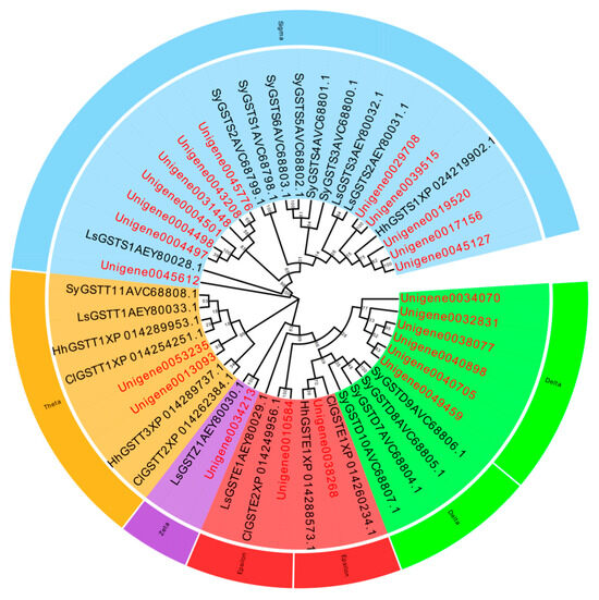 Phylogenetic evolutionary tree of Glutathione S-transferase genes of L. pratensis (red) with other insects (black). Note: The amino acid sequences of Cimex lectularius (Cl), Halyomorpha halys (Hh), Laodelphax striatellus (Ls), and Subpsaltria yangi (Sy) were analyzed using the MEGA-11 adjacent method. Green is a branch of the GST-Delta (D) family, red is a branch of the GST-Epsilon (E) family, purple is a branch of the GST-Zeta (Z) family, orange is a branch of the GST-Theta (T) family, and blue is a branch of the GST-Sigma (S) family. The two letters before the gene names are the species name. The topology was tested using bootstrap analyses (1000 replicates), and the number on the branch indicates the confidence coefficient.
