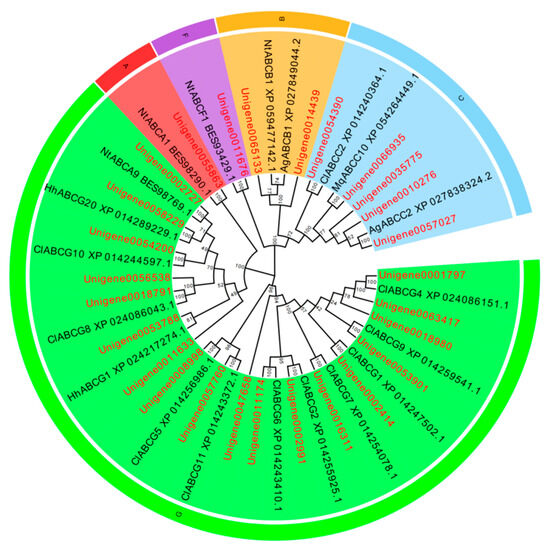 Phylogenetic evolutionary tree of ABC transporter genes from L. pratensis (red) with other insects (black). Note: The amino acid sequences of Cimex lectularius (Cl), Halyomorpha halys (Hh), Macrosteles quadrilineatus (Mq), and Nesidiocoris tenuis (Nt) were analyzed using the MEGA-11 adjacency method. Red is a branch of the ABC-A family, orange is a branch of the ABC-B family, blue is a branch of the ABC-C family, purple is a branch of the ABC-F family, and green is an ABC-G family branch. The two letters before the gene names are the species name. The topology was tested using bootstrap analyses (1000 replicates), and the number on the branch indicates the confidence coefficient.