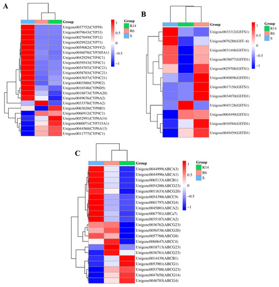 Analysis of differentially expressed genes associated with detoxification metabolism resistance: (A) Cytochrome P450 gene differential expression heat map; (B) Glutathione S-transferase gene differential expression heat map; and (C) ABC transporter gene differential expression heat map (red indicates up-regulation; blue indicates down-regulation).