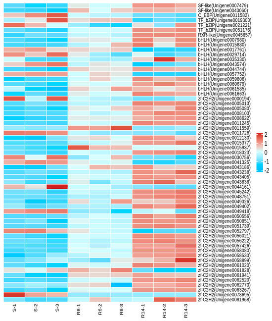 Based on the assembled unigenes of L. pratensis, a preliminary selection of 1499 transcription factors (TFs) belonging to 64 families was carried out, including 956 TFs from the zf-C2H2 family, 70 TFs from the Homeobox family, 50 TFs from the THAP family, 43 TFs from the MYB family, 42 TFs from the bHLH family, 39 TFs from the HTH family, 32 TFs from the HMG family, 21 TFs from the TF_bZIP family, 19 TFs from the Fork head family, and 12 TFs from the zf-LITAF-like family (Table 1; Supplementary Materials Figure S6). In S-VS-R6, a total of 269 differential transcription factors were identified, with 184 up-regulated and 85 down-regulated; in S-VS-R14, a total of 744 differential transcription factors were identified, with 698 up-regulated and 146 down-regulated. The identified differential transcription factor families are mainly distributed in the zf-C2H2, Homeobox, THAP, MYB, bHLH, HTH, HMG, and TF_bZIP families (Table 2).