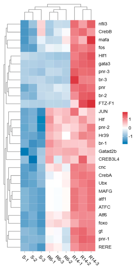 Based on a literature search (Gao et al., 2018 [58]) and transcription factor annotation information, the transcription factor families related to resistance in S-VS-R6 and S-VS-R14 were identified as zf-C2H2, TF_bZIP, bHLH, SF-like, C_EBP, RXR-like, zf-GATA, ZBTB Homeobox, Fork head, etc. (Supplementary Materials Table S4). The heat map (Figure 8) shows that the expression levels of zf-C2H2, TF_bZIP, bHLH, SF-like, C_EBP, and RXR-like transcription factors in R6 and R14 are significantly higher than in S, indicating their important role in the response to external stress. At the same time, we also mined key transcription factors that respond to the development of pyrethroid resistance, mainly concentrated in the TF bZIP, zf-GATA, ZBTB, SF-like, Homeobox, Fork head families (Table 3), among which CncC/Maf, CREB, GATA, FOXO, etc., are the transcription factors involved in the metabolic pathways of pyrethroid insecticides and the focus of subsequent regulatory mechanism research.