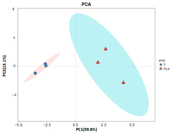 The principal component analysis (PCA) of six samples from two groups of L. pratensis was performed using the R package (https://ggplot2.tidyverse.org/, accessed on 30 February 2022) (R Foundation for Statistical Computing, Vienna, Austria). As shown in Figure 10, PC1 accounted for the largest variance in the proteomic data, representing 59.8% of the total variance. It primarily reflected the differences between the susceptible strain (S) and the 14th-generation resistant strain (R14). On the PC1 axis, the S and R14 strains exhibited a complete separation trend, indicating significant differences in protein expression levels. PC2 accounted for the second-largest variance in the data, representing 13.1% of the total variance, and further distinguished the differences among the samples within the R14 strain. On the PC2 axis, the three replicates clustered closely together, indicating good reproducibility of the PCA results. The PCA results demonstrated significant differences between S and the R14 strain in terms of gene expression and protein expression levels. These differences are likely closely related to the development of lambda-cyhalothrin resistance. Additionally, the R14 strain exhibited good reproducibility at both the transcriptional and translational levels, further validating the reliability and consistency of data.