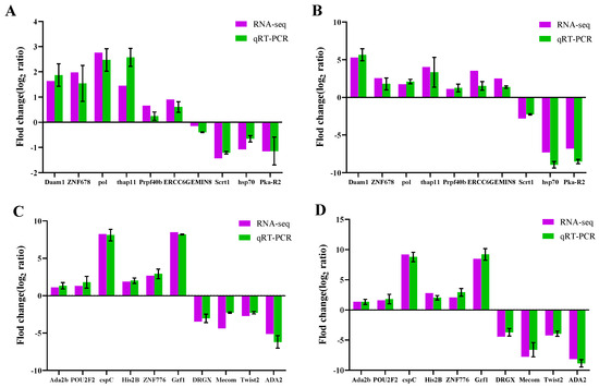 Validation of differentially expressed genes between RT-qPCR and RNA-Seq: (A) S-VS-R6; (B) S-VS-R14 (note: differentially expressed gene); (C) S-VS-R6; and (D) S-VS-R14 (note: differential expression of transcription factors).