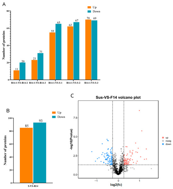 For the identification, a threshold was set where a protein with a Fold Change (FC) ≥ 1.2 and a p-value < 0.05 was considered to be differentially expressed. After analyzing the proteins across six samples, a total of 178 DEPs were identified. The results showed (Figure 11A,C) that 11 proteins were significantly up-regulated, and 20 proteins were significantly down-regulated in the group of R14-1-VS-R14-2, while 23 proteins were significantly up-regulated, and 31 proteins were significantly down-regulated in the R14-1-VS-R14-3 group. For R14-1-VS-S-1, 55 proteins were significantly up-regulated, and 65 proteins were significantly down-regulated. For R14-1-VS-S-2, 62 proteins were significantly up-regulated, and 67 proteins were significantly down-regulated, while in the group of R14-1-VS-S-3, 72 proteins were significantly up-regulated, and 69 proteins were significantly down-regulated. In summary, in “S-VS-R14”, 85 proteins were significantly up-regulated, and 93 proteins were significantly down-regulated (Figure 11B).
