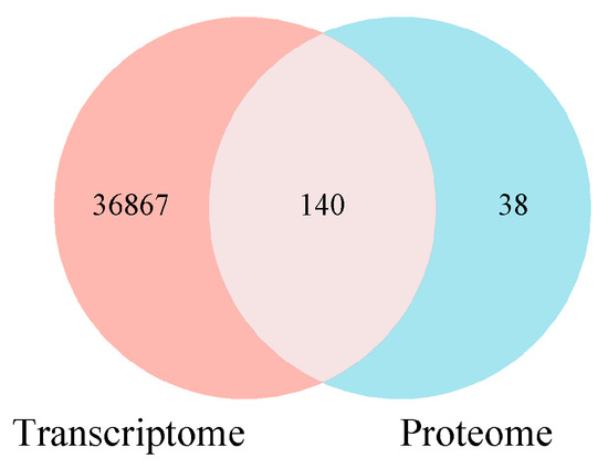 Venn diagram of differentially expressed genes and protein numbers. Note: Genes/proteins outside the threshold lines indicate significant differences, while those inside the threshold lines indicate non-significant differences.