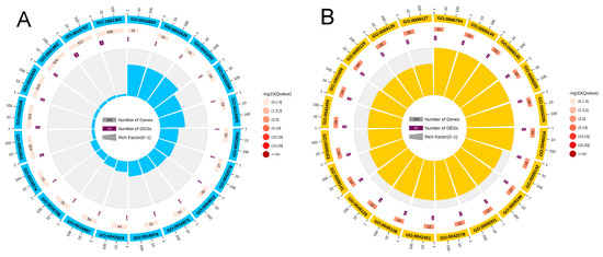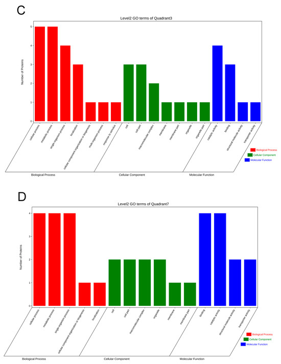 DEGs/DEPs GO enrichment classification: (A) co-up-regulated DEGs/DEPs GO enrichment cycle; (B) co-down-regulated DEGs/DEPs GO enrichment cycle; (C) co-up-regulated DEGs/DEPs GO enrichment column; and (D) co-down-regulated DEGs/DEPs GO enrichment column diagram.