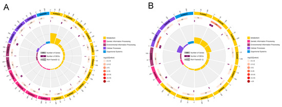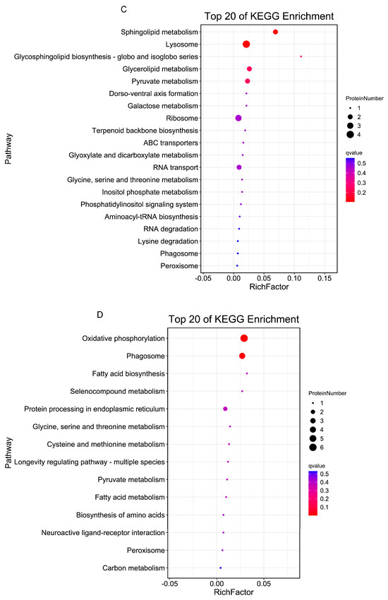 The GO and KEGG enrichment analyses were performed for DEGs and DEPs with consistent expression trends in quadrants 3 and 7 of Figure 15. In quadrant 3, the DEGs/DEPs with the same expression trend were co-up-regulated, and the GO enrichment loop shows that DEGs/DEPs are mainly enriched in “Molecular Information” (Figure 16A,C). The KEGG pathway enrichment analysis indicates that 23 DEGs/DEPs genes are enriched in 23 pathways, which are primarily enriched in pathways such as “Sphingolipid metabolism”, “Glycosphingolipid biosynthesis–globo and isoglobo series”, “Dorso–ventral axis formation”, “Ribosome”, “Terpenoid backbone biosynthesis”, “ABC transporters”, “RNA transport” and “Peroxisome” (Figure 17A,C). Quadrant 7 contains DEGs/DEPs that are consistently down-regulated, and the GO enrichment loop shows that DEGs/DEPs are mainly enriched in “Biological Process” (Figure 16B,D). Based on the KEGG database, 17 DEGs/DEPs genes are enriched in 14 pathways. They are primarily enriched in pathways such as “Oxidative phosphorylation”, “Phagosome”, “Fatty acid biosynthesis”, “Selenocompound metabolism”, “Protein processing in endoplasmic reticulum”, “Biosynthesis of amino acids”, “Neuroactive ligand–receptor interaction”, “Peroxisome”, and “Carbon metabolism” (Figure 17B,D). When combining with key genes identified at the transcriptional level in previous studies, it was found in the correlation analysis that one P450 gene is significantly up-regulated at both the transcriptional and translational levels, annotated as Cytochrome P450 CYP6A13 (GenBank accession number: MN782520) [59] suggesting that its overexpression might be involved in resistance to lambda-cyhalothrin.