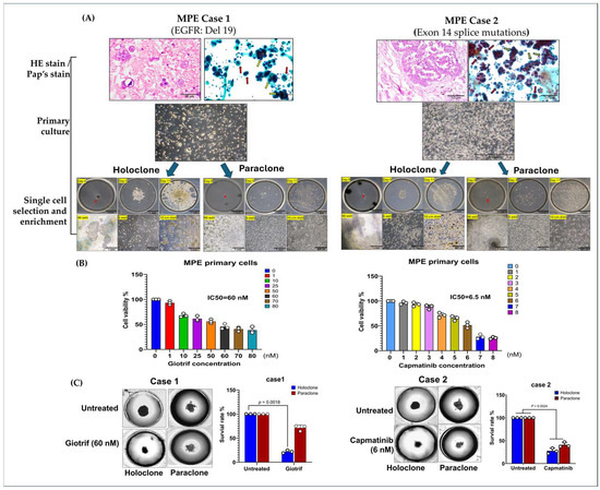Phenotypic Heterogeneity and Tumorsphere-Based Drug Response Evidence in Primary MPE Cultures. (A) Hematoxylin–eosin (HE) and Papanicolaou’s staining of primary cultures revealed both clustered (yellow arrow) and individually (red arrow) dispersed cell morphologies. In primary cultures, cells displayed both elongated and floating spherical phenotypes. By applying single-cell isolation and expansion techniques, we successfully established two distinct subclones—Holoclone and Paraclone—thereby underscoring their remarkable phenotypic plasticity. (B) In the 3D culture system, MPE primary cells formed stable spheroids within 96 h. Drug sensitivity assays using the 3D tumorsphere model showed that Giotrif (afatinib) at 60 nM and Capmatinib at 6.5 nM achieved IC50. (C) Between the two subclones, the holoclone demonstrated marked sensitivity to Giotrif, whereas the paraclone exhibited only a limited response. In contrast, Capmatinib inhibited Holoclone and Paraclone growth, demonstrating its pronounced inhibitory efficacy against both subclone types. The results are means ± SD for each group of cells from three separate experiments.