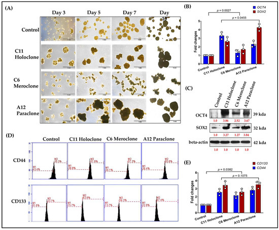 In stem cell and cancer stem cell (CSC) research, OCT4 and SOX2 are pivotal transcription factors linked to pluripotency. Their expression correlates with strong proliferative and regenerative capacities. To assess CSC-like traits in the Holoclone, Meroclone, and Paraclone subclones, we examined self-renewal and spheroid formation. After 10 days, Holoclone and Paraclone formed significantly larger spheroids than Control and Meroclone (Figure 4A). Spheroid formation under suspension and nutrient-poor conditions is a hallmark of CSC properties, reflecting robust self-renewal and resilience. While Meroclone exhibited a distinctive spiky morphology, it failed to form spheroids as effectively, suggesting an intermediate state with less pronounced CSC features.