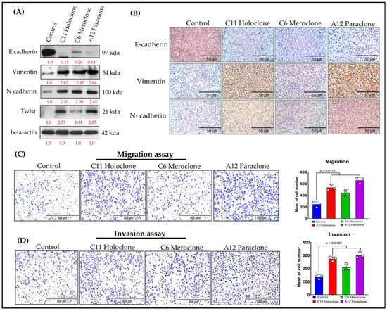 Previous studies show that chemoresistant lung cancer subpopulations often express CSC markers and adopt epithelial–mesenchymal transition (EMT)-associated phenotypes [2,3]. EMT involves a loss of epithelial characteristics—such as E-cadherin expression—and acquisition of mesenchymal features, including increased Vimentin and N-cadherin levels. These changes enhance cell migration, invasion, and overall adaptability, contributing to tumor progression and drug resistance. To clarify this dynamic, we analyzed EMT-related biomarkers in three resistant A549 subclones: Holoclone, Meroclone, and Paraclone. Unlike Control cells, which maintained high E-cadherin expression and epithelial integrity, none of the resistant subclones expressed E-cadherin. Instead, all three exhibited elevated Vimentin and N-cadherin (Figure 5A,B). This shift reflects a mesenchymal phenotype, likely driven by chemotherapeutic pressure. We also examined Twist, a key EMT-transcription factor. Holoclone and Paraclone strongly upregulated Twist, correlating with pronounced EMT and the near-complete loss of epithelial markers. Meroclone displayed a more moderate profile, implying an intermediate EMT state. Functional assays confirmed these molecular traits: all resistant subclones showed enhanced migratory abilities compared to Control cells (Figure 5C), while Holoclone and Paraclone demonstrated particularly high invasive potential (Figure 5D), suggesting a vital role in advancing metastasis and therapy evasion.