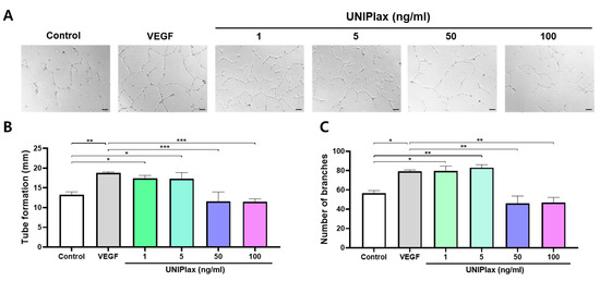 2.2. UNIPlax Promotes the Angiogenic Ability of HUVECs