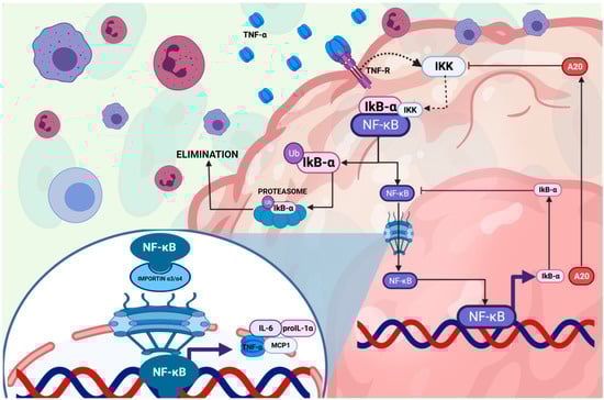 The NF-κB pathway activation by tumor necrosis factor α (TNF-α) and its impact on the regulation of inflammation at the cellular level. Tumor necrosis factor-alpha (TNF-α) through the NF-κB pathway and its impact on inflammatory regulation at the cellular level. The following key events are described: Production of TNF-α: Immune cells such as macrophages and lymphocytes release TNF-α in response to inflammatory stimuli. Receptor Interaction: TNF-α binds to the TNF-R receptor located in the plasma membrane, triggering an intracellular signaling cascade. IKK Complex Activation: TNF-α receptor binding recruits and activates the IKK (IκB kinase) complex, responsible for phosphorylating IκB-α, an inhibitory protein associated with the NF-κB transcription factor. IκB-α Degradation: Phosphorylation of IκB-α leads to its ubiquitination and subsequent degradation in the proteasome, releasing NF-κB. Nuclear Translocation of NF-κB: Once released, the NF-κB complex translocates to the nucleus, where it regulates the transcription of proinflammatory genes. Proinflammatory Gene Expression: NF-κB induces the expression of cytokines such as IL-6, IL-1β, and chemokines like MCP-1, which amplify the inflammatory response. Negative Regulation by A20: The diagram includes the role of A20 as a negative regulator of this pathway, inhibiting IKK complex activity to limit inflammatory signaling. Create by BioRender.com.