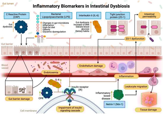 Various inflammatory biomarkers, such as IL-6, interleukin-10 (IL-10), hs-CRP, and lipopolysaccharide (LPS), are critical in the assessment of chronic inflammation associated with intestinal dysbiosis. These markers are essential for understanding how alterations in the intestinal microbiota and immune activation may contribute to the development of metabolic diseases such as diabetes. Specifically, IL-6 and hs-CRP are known for their pro-inflammatory functions, while IL-10 acts as an anti-inflammatory regulator. On the other hand, LPS, a component of gram-negative bacteria, has been implicated in immune system activation and the enhancement of systemic inflammation. These biomarkers may indicate a persistent inflammatory state that predisposes individuals to metabolic and autoimmune diseases, including forms of diabetes [27].