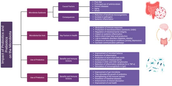 Impact of probiotics and prebiotics on microbiota. The diagram illustrates the effects of probiotics and prebiotics on gut microbiota and their role in maintaining health. It highlights the causal factors and consequences of microbiota dysbiosis, the key functions of the microbiota–gut axis in health, and the specific benefits of probiotic and prebiotic use. Probiotics contribute to microbial balance, inflammation reduction, and immune modulation, while prebiotics stimulate the growth of beneficial bacteria, enhance mineral absorption, and support intestinal health. The figure also emphasizes the interplay between gut microbiota and systemic processes, including immune responses and neurological conditions.