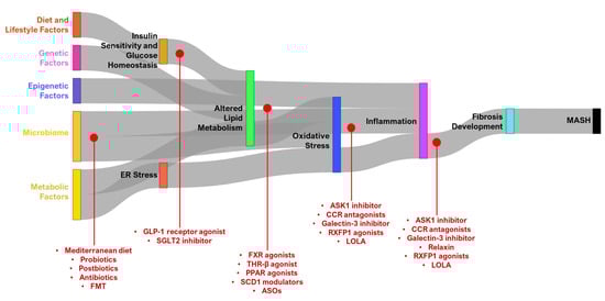 | Reducing Oxidative Stress and Inflammation | ASK1 inhibitor | Selonsertib [168,169,170] | Inhibits apoptosis signal-regulating kinase 1 (ASK1), involved in inflammation and apoptosis pathways | Small molecule; reduces hepatic macrophage and stellate cell activation, thereby decreasing hepatic inflammation and fibrosis |