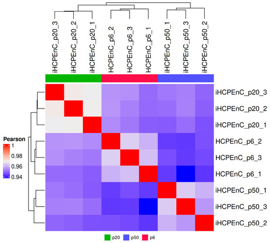Figure 1). As 0.94 is the lowest value, the Pearson coefficient proves a strong positive correlation between the samples. HCPEnCs p6, iHCPEnCs p20, and iHCPEnCs p50 transcriptomes cluster by cell type and passage number, and HCPEnCs p6 are more similar to iHCPEnCs p20 than to iHCPEnCs p50. Overall, however, a high degree of correspondence between the primary cells and the immortalized cells of the two passages can be demonstrated.