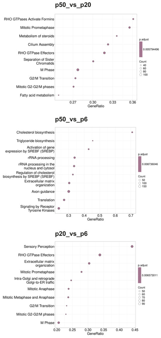 p-value and FDR < 0.05. Genes in this category were considered significant. This analysis identified a total of 2899 genes for p20_vs_p6, 3038 genes for p50_vs_p6, and 4791 genes for p50_vs_p20, whose expressions were significantly different from each other (