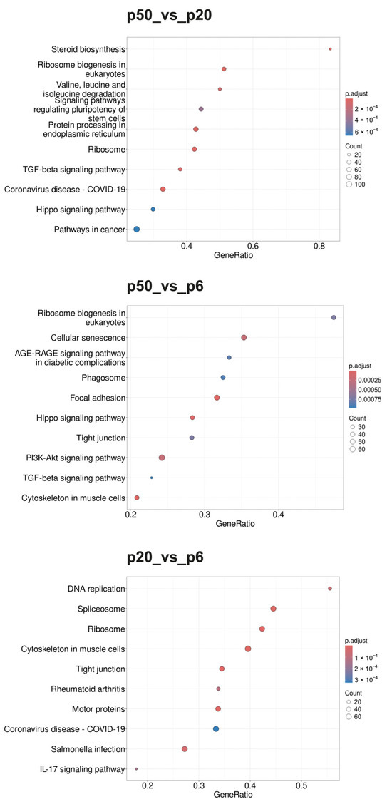 When considering the proportions of significant DEGs and the total number of transcripts examined, only 18% of the analyzed genes are significantly differentially expressed in the comparison p50_vs_p20, which implies a still high similarity of these two passages. Importantly, in both the comparisons p6_vs_p20 and p6_vs_p50, only about 11% of the total 26,586 transcripts examined were differentially expressed. How the changes in gene expression are altered during passaging can be determined superficially by dividing them into up- and downregulated DEGs. It was particularly noticeable that the proportion of downregulated DEGs decreased and the proportion of upregulated DEGs increased during passaging. In part, this could be a matter of cellular corrections that compensate for deviations that occurred previously, e.g., as a result of the immortalization of the cells. This is supported by the fact that some DEGs, which were significantly differentially expressed in p20_vs_p6, were no longer identified in p50_vs_p6. DEGs that were upregulated in p20_vs_p6 and downregulated in p50_vs_p6 or vice versa also support this hypothesis.