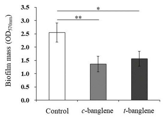 A Cell Desk–biofilm formation assay at 48 h revealed that c-banglene significantly inhibited biofilm formation by P. gingivalis (Figure 2), resulting in a 47% reduction in the biofilm mass (Figure 2). We also showed that t-banglene significantly inhibited 48 h biofilm formation, resulting in a 40% reduction in the biofilm mass. These results revealed that c- and t-banglenes exhibit antibiofilm effects against P. gingivalis.