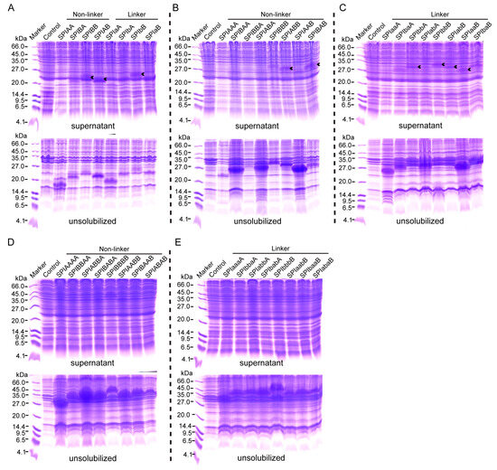 Protein expression of tandem multimers with different combinatorial forms of BmSPI38 and BmSPI39. (A) SDS-PAGE analysis of tandem dimer proteins. (B) SDS-PAGE analysis of tandem trimer proteins without linker sequence. (C) SDS-PAGE analysis of tandem trimer proteins with linker sequence. (D) SDS-PAGE analysis of tandem tetramer proteins without linker sequence. (E) SDS-PAGE analysis of tandem tetramer proteins with linker sequence. E. coli cells, containing the empty p28 vector, were induced with the same final concentration of IPTG as the control. The terms “supernatant” and “unsolubilized” represent the supernatant and unsolubilized fraction of the E. coli lysates, respectively. The arrows show the tandem multimer fusion proteins with different combinatorial forms of BmSPI38 and BmSPI39 expressed in E. coli.