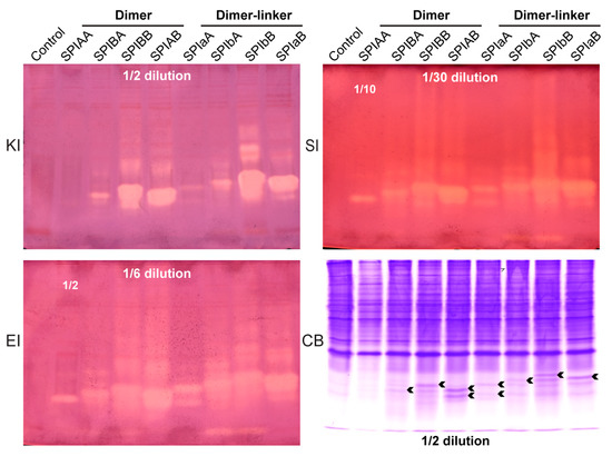 Analysis of the inhibitory activity of tandem dimers with different combinatorial forms of BmSPI38 and BmSPI39 using in-gel activity staining. “KI”, “SI”, and “EI” represent in-gel activity staining for the protease K inhibitor, subtilisin inhibitor, and elastase inhibitor, respectively. “CB” represents Coomassie brilliant blue R-250 staining under the same electrophoresis conditions. A supernatant fraction of E. coli cells transformed with the p28 plasmid was used as a negative control. It should be noted that “1/2”, “1/6”, “1/10”, and “1/30” dilution, respectively, means that the corresponding bacterial lysate supernatant was diluted 2, 6, 10, and 30 times, respectively, and then, the same volume of the protein sample was used for Native PAGE. The arrow indicates the expression bands of the fusion proteins stained with Coomassie brilliant blue R-250 corresponding to the inhibitory activity bands.