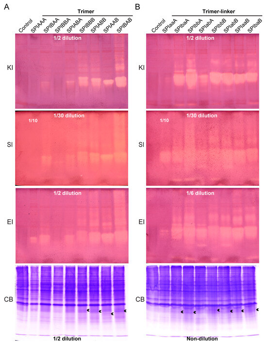 Analysis of the inhibitory activity of tandem trimers with different combinatorial forms of BmSPI38 and BmSPI39 using in-gel activity staining. (A) Alkaline Native PAGE analysis of BmSPI38 and BmSPI39 tandem trimer proteins without a linker sequence. (B) Alkaline Native PAGE analysis of BmSPI38 and BmSPI39 tandem trimer proteins with a linker sequence. “KI”, “SI”, and “EI” represent in-gel activity staining for the protease K inhibitor, subtilisin inhibitor, and elastase inhibitor, respectively. “CB” represents Coomassie brilliant blue R-250 staining under the same electrophoresis conditions. A supernatant fraction of E. coli cells transformed with the p28 plasmid was used as a negative control. It should be noted that “1/2”, “1/6”, “1/10”, and “1/30” dilution, respectively, means that the corresponding bacterial lysate supernatant was diluted 2, 6, 10, and 30 times, respectively, and then, the same volume of the protein sample was used for Native PAGE. The arrow indicates the expression bands of the fusion proteins stained with Coomassie brilliant blue R-250 corresponding to the inhibitory activity bands. “Non-dilution” indicates that the protein sample used for Native PAGE was not diluted.