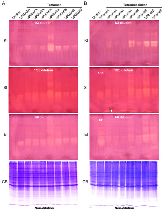 Analysis of the inhibitory activity of tandem tetramers with different combinatorial forms of BmSPI38 and BmSPI39 using in-gel activity staining. (A) Alkaline Native PAGE analysis of BmSPI38 and BmSPI39 tandem tetramer proteins without a linker sequence. (B) Alkaline Native PAGE analysis of BmSPI38 and BmSPI39 tandem tetramer proteins with a linker sequence. “KI”, “SI”, and “EI” represent in-gel activity staining for the protease K inhibitor, subtilisin inhibitor, and elastase inhibitor, respectively. “CB” represents Coomassie brilliant blue R-250 staining under the same electrophoresis conditions. A supernatant fraction of E. coli cells transformed with the p28 plasmid was used as a negative control. It should be noted that “1/2”, “1/6”, “1/10”, “1/20”, and “1/30” dilution, respectively, means that the corresponding bacterial lysate supernatant was diluted 2, 6, 10, 20, and 30 times, respectively, and then, the same volume of the protein sample was used for Native PAGE. “Non-dilution” indicates that the protein sample used for Native PAGE was not diluted.