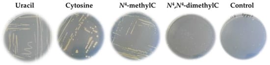 Growth of the E. coli ∆pyrF::Km strain on the M9 agar minimal medium supplemented with either uracil, cytosine, N4-methylcytosine, N4,N4-dimethylcytosine, or without any heterocyclic base (control). The agar plates were incubated at 37 °C for 72 h.