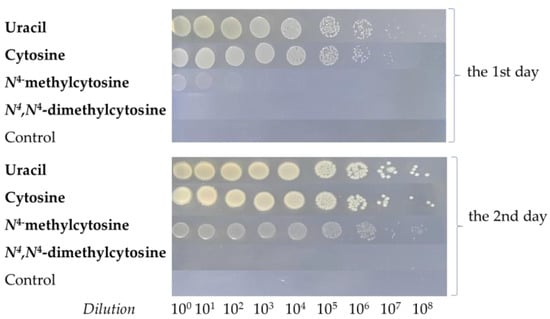 For better comparison of growth rates of the E. coli ∆pyrF::Km strain in M9 solid medium supplemented with the tested above-modified cytosines, serial dilutions of cells obtained from the overnight culture were plated on the agarized M9 medium with the same modified bases and controls as described above. Figure 2 demonstrates that after 1 day (approx. 24 h) of growth, a similar growth rate was observed when either uracil or cytosine was used as substrates, whereas only some growth was observed for N4-methylcytosine. At the same time, no growth was observed when N4,N4-dimethylcytosine was used as a source of uracil or any heterocyclic base was not added. However, after 2 days (approx. 48 h), clearly visible growth in the medium with N4-methylcytosine was observed, whereas both uracil and cytosine strongly supported the growth. As after 1 day, no growth was observed when N4,N4-dimethylcytosine or no heterocyclic base was added.