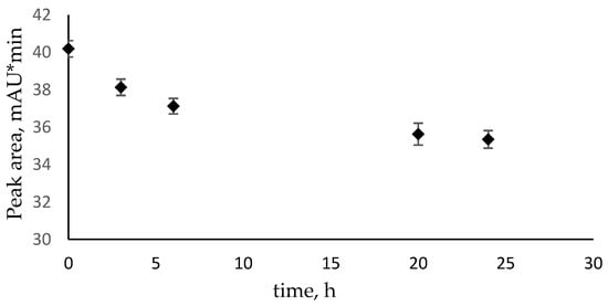 To demonstrate that N4-methylcytosine is consumed during the growth of the E. coli ∆pyrF::Km strain in M9, samples of the medium obtained during the growth of bacteria were collected and analyzed by HPLC. Figure 4 demonstrates that the concentration of N4-methylcytosine rapidly decreases during the first six hours of growth and continues to decrease during the rest of the observed growth period. HPLC chromatograms representing the decrease in the peak area are shown in Figure S4. After 24 h of growth, around 12% of N4-methylcytosine was consumed and presumably converted into cytosine, further into uracil, for supporting the growth.