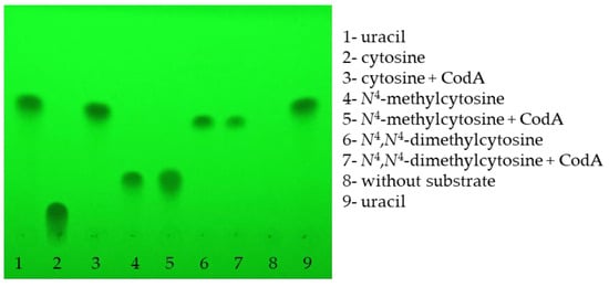 Cytosine deaminase CodA does not convert N4-methylcytosine or N4,N4-dimethylcytosine into uracil. Thin-layer chromatography (TLC) plate of cytosine, N4-methylcytosine, or N4,N4-dimethylcytosine enzymatic reactions with CodA.