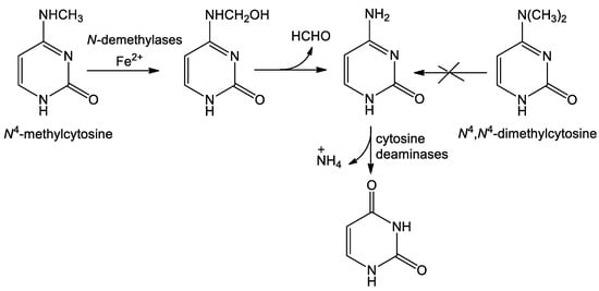 How N4-methylcytosine is converted into cytosine is unclear, even at the level of nucleosides, nucleotides, or nucleic acids. It was previously demonstrated that some cytidine deaminases are capable of converting both N4-methylcytidine and N4,N4-dimethylcytidine into uridine []. However, it is likely that N4-methylcytidine is not a physiological substrate of cytidine deaminase isolated from E. coli B, since the observed Km/Vmax values were at least three orders of magnitude higher than those of cytidine deamination []. For a long time, the m4C modification was considered as being part of the bacterial restriction/modification system []. However, the presence of this modification in transposable elements of the freshwater invertebrate Adineta vaga was associated with their transcriptional repression []. In that work, N4CMT, a horizontally transferred enzyme of bacterial origin, was identified as DNA m4C methyltransferase (“writer” enzyme). However, the demethylation (“eraser”) enzyme for this modification is unknown. Recently, it was suggested [] that its catalytic activity may be similar to that of AlkB proteins that are responsible for m6A demethylation in RNA. Indeed, both AlkB family non-heme Fe(II)/2-oxoglutarate-dependent oxygenases FTO and ALKBH5 act as oxidative m6A demethylases, but their action yields different products, hm6A and A, respectively []. In the case of small molecules, N-dealkylation is often performed by the cytochrome P450 superfamily of heme-containing monooxygenases []. Bacterial P450 was successfully used to convert drug verapamil into norverapamil []. Therefore, one may envision the following scenario of N4-methylcytosine demethylation to yield the cytosine and then the uracil (Figure 6). As mentioned above [], N4,N4-dimethylcytidine may be a substrate for conversion into uridine by cytidine deaminases. Here, we propose different reaction mechanisms for the removal of N4-methyl groups. At least two N-dimethylated heterocyclic bases (m62A and m22G, see []) exist in RNA. It was demonstrated that ALKBH5 catalyzes demethylation of m62A using rRNA or oligoribonucleotides as substrates []. However, removal of the first methyl group may be the rate-limiting step (see Figure 4D in []). Demethylation of N4,N4-dimethylcytosine may occur in a similar manner, which is reflected in the slow, if any, conversion into N4-methylcytosine and further into cytosine and uracil to support the growth of uracil auxotrophs.