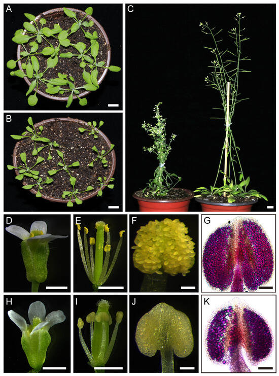 Phenotypes of pUBQ10:TCP5 transgenic plants: (A) three-week-old wild-type plants; (B) three-week-old pUBQ10:TCP5 plants with slightly narrower downward rosette leaves; (C) six-week-old pUBQ10:TCP5 plants (left) showing a dwarf and non-elongated silique phenotype compared with the wild type (right); (D–K) flower and anther morphology; (D,H) flowers of the wild type (D) and the pUBQ10:TCP5 plant (H) at the anthesis stage; (E,I) sepals and petals removed from the wild type (E) and the pUBQ10:TCP5 flowers (I); (F,J) wild-type anther with many released pollen grains (F) and a non-dehisced anther from the pUBQ10:TCP5 plant (J) at anthesis; and (G,K) wild-type anther (G) and pUBQ10:TCP5 anther (K) after Alexander staining. Scale bars: 1 cm in (A–C); 1 mm in (D,E,H,I); and 50 μm in (F,G,J,K).